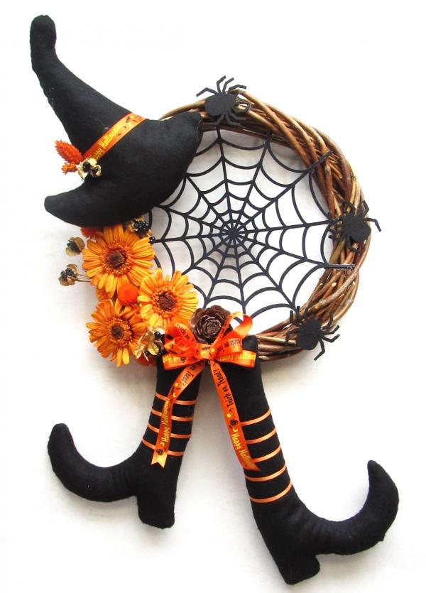 | ハロウィン魔女のリース *********************************************************** 10月31日はハロウィン! ハロウィンは古代ケルト人が起源の行事で秋の収穫を祝い 悪霊を追い払う意味をもっています。 アメリカでは魔女やお化けに変装した子供たちが「お菓子をくれないといたずら するよ」といいながら近所の家を回るという楽しいお祭りになっています。 フェルトで魔女の帽子とブーツを作り、プリザーブドフラワーの ガーベラ、センニチコウ、シロヤマブキの実、シダローズを アレンジしたハロウィン魔女のリースです。 ******************************************************************* |
