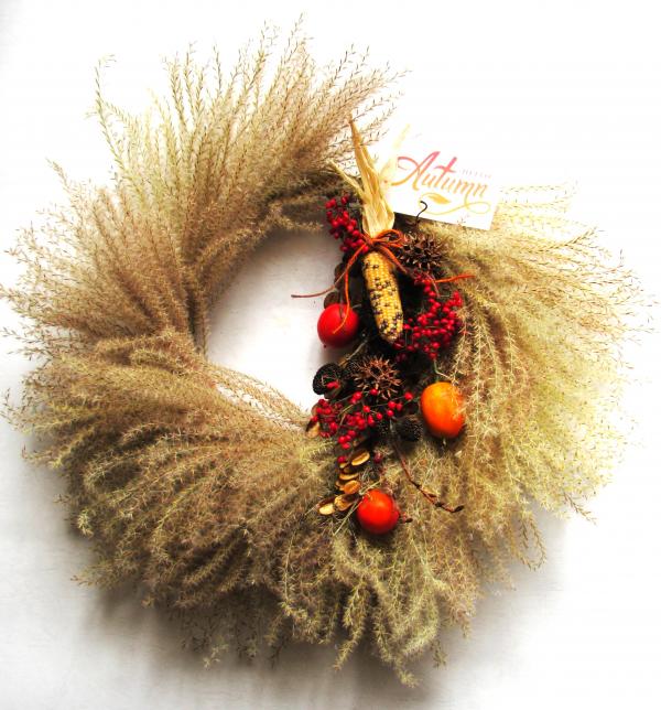 | ススキと秋の実物のリース *********************************************************** 秋の七草の一つであるススキは災いから身を守り 豊穣を象徴する縁起のよい植物です。 穂先が広がりふわふわとしたススキを秋の実物のガマズミ カラスウリ、ヤシャブシ、オニドコロ、モミジバフウ ミニコーンと合わせたリースです 玄関のドアやお部屋の壁に飾って深まる秋を楽しみましょう。 ******************************************************************* |